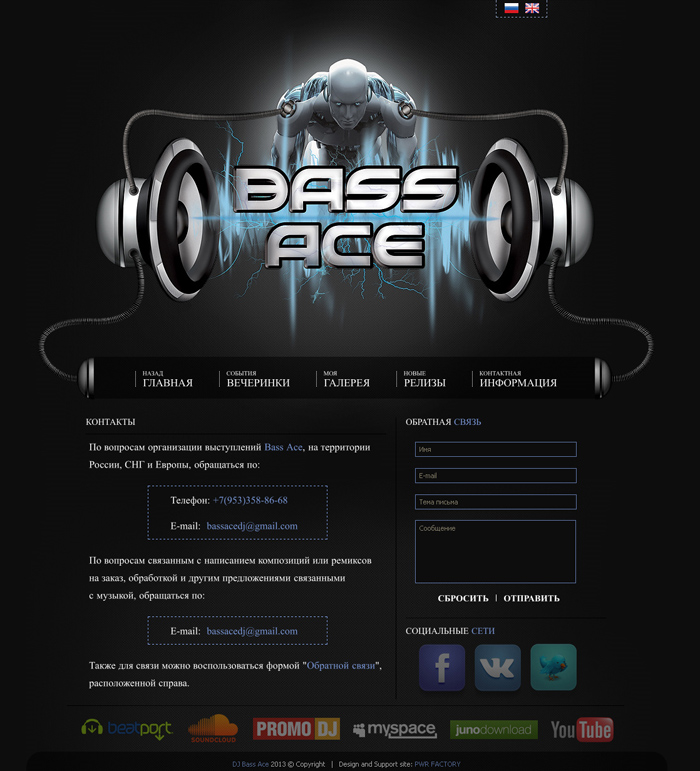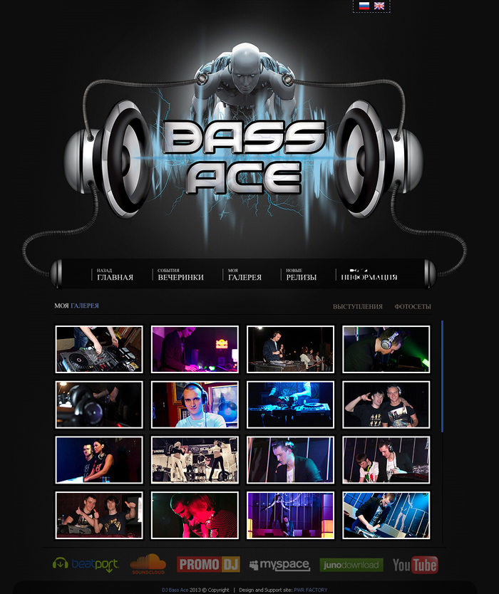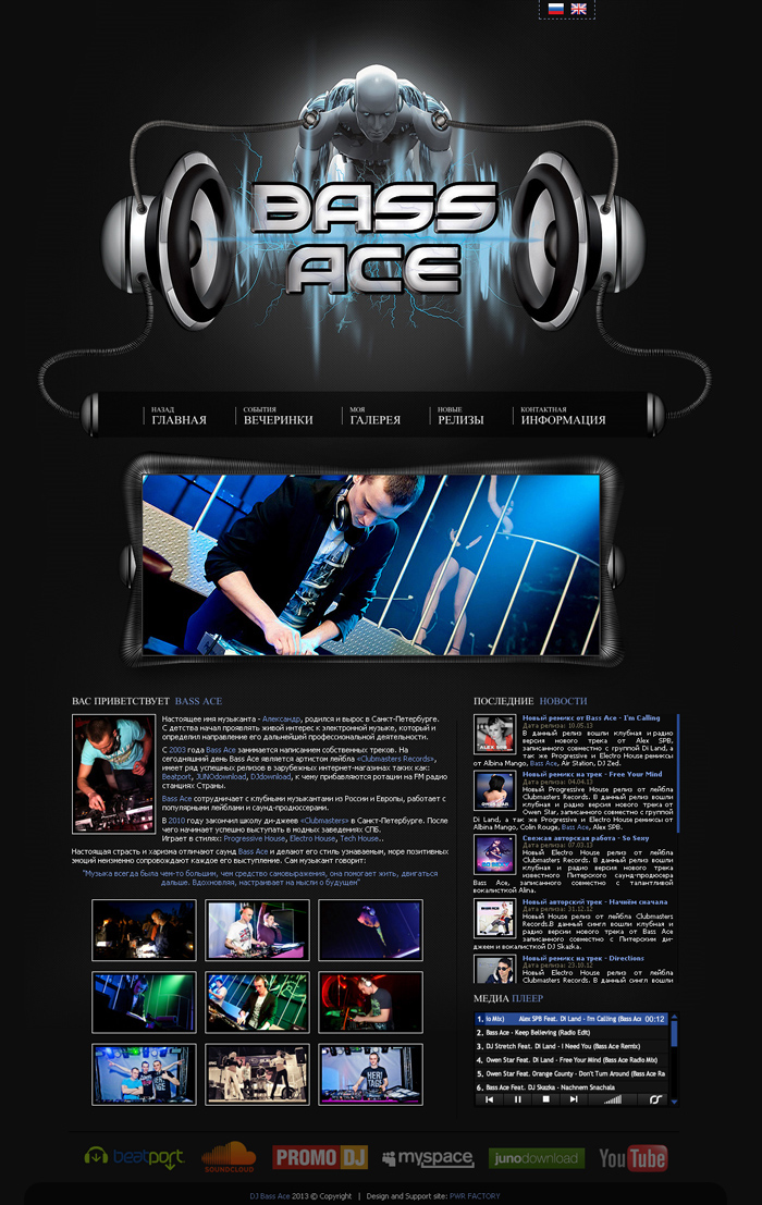 Описание: Сайт для DJ, музыканта из Санк-Петербурга BassAce. Интерефейс сайта, для удобства использования, выполнен на двух языках, это Английский и Русский, страницы связаны, так что после переключения языка вы остаётесь на нужной вам странице, но она уже отображается на выбранном языке...