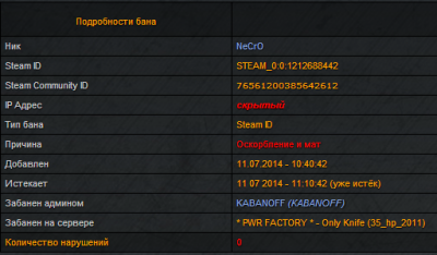 4. Игрок NeCro был забанен утром 11.07.2014 за мат и оскорбления админом kabanoff на полчаса. Без предупреждений или гагов и киков с сервера.