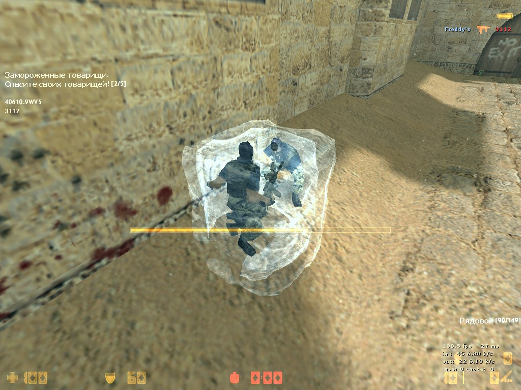 Цитата: Что бы разморозить товарища, необходимо подойти к замороженному игроку и зажать E (USE), процесс разморозки сопровождается информацией в виде timebar как для размораживающего, так и для размораживаемого.