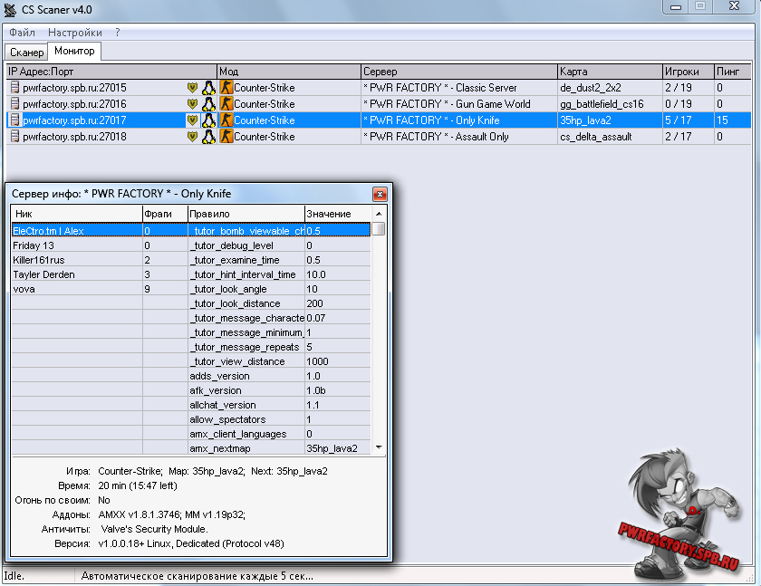 С помощью CS Scaner вы с легкостью определите не только колличество игроков на сервере и пинг, но и узнаете какой анти-чит установлен, есть ли пароль, какие дополнение, имена самих игроков, колличество фрагов - вообщем все то, что бы пригодилось настоящему любители поиграть в сети.