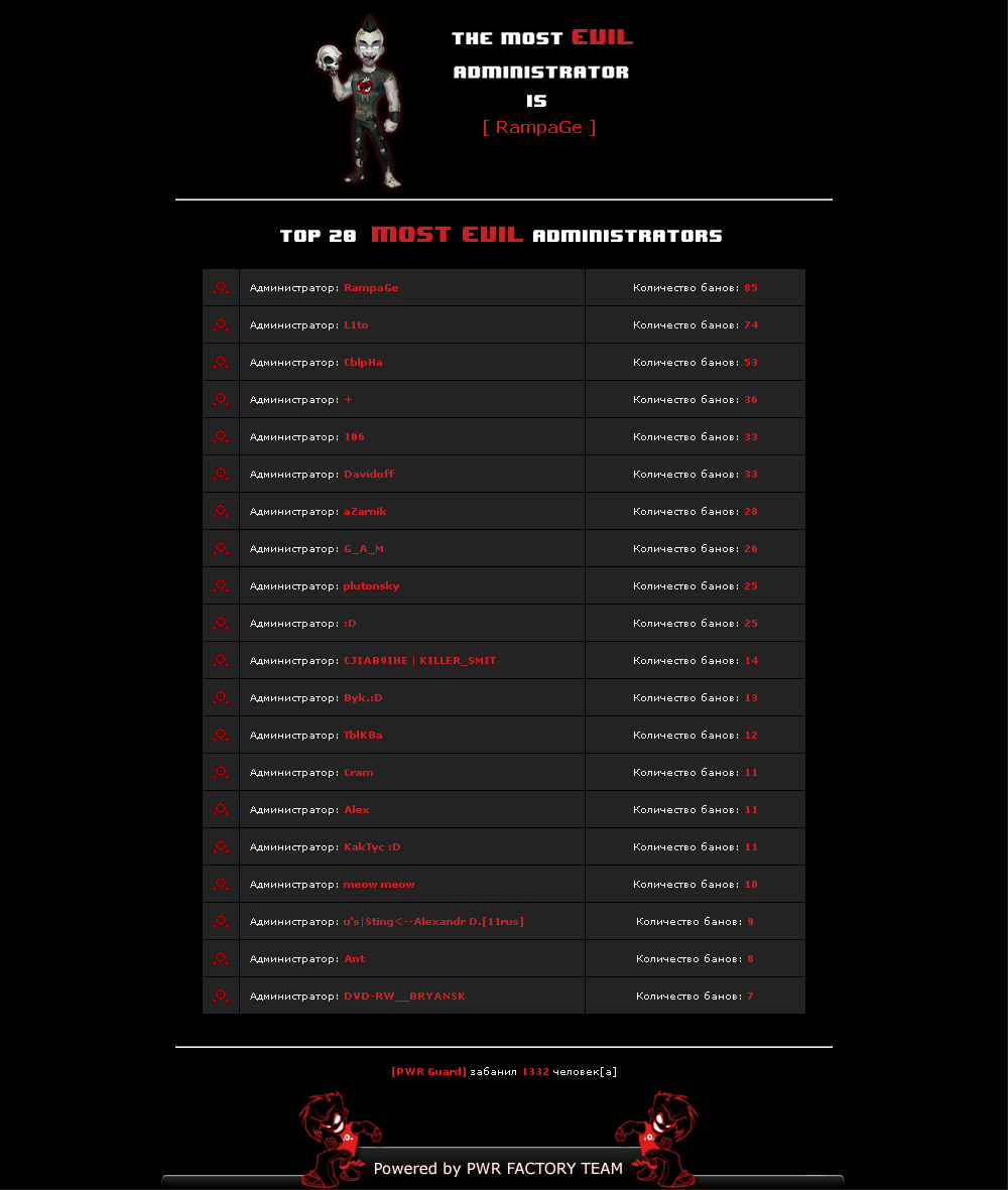 По просьбе трудящихся сделал топ 20 самых злых администраторов наших серверов. Страничка с простеньким дизайном, ничего лишнего.