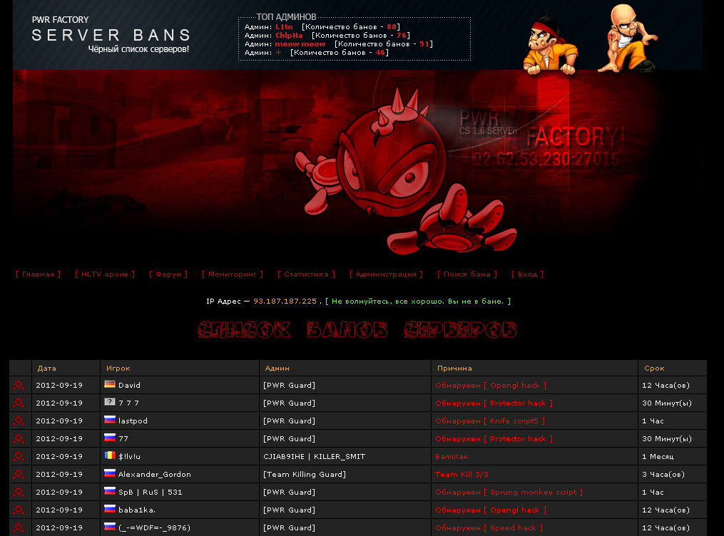 Сегодня, окончательно запарившись смотреть на пустую шапку, начал модификацию с банлиста. Думал, думал я и решил, что на пустое место надо вывести лучших администраторов наших серверов, может хоть это заставит их играть под своими никами, т.к. топ формируется по количеству банов.