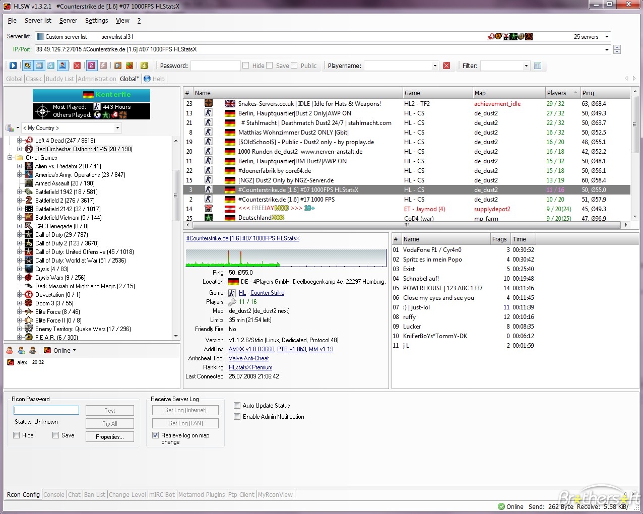 Очень удобная и простая в управлении программа, с ее помощью вы можете: изменять настройки сервера, видеть чат который используют игроки на вашем сервере (Say, Say_team). Также вы получите полный список карт которые есть в папке maps на сервере, сможете посмотреть список банов (IP и время) , давать разбан и бан по ип, сможете убивать игроков (Slap), давать бан на время от 1 до 1337 и перманент, сможете видеть пинг, кол-во игроков, игру, есть (нет) пароль на сервере и много многое другое, а главное - это, то что может делать любой у кого есть доступ к R-con паролю (R-con пароль прописывается в server.cfg как rcon_password "ваш пароль" Программа создана для того что бы не заходя в кс выполнят те же функции amxmodmenu и не только...